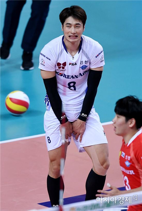 [아시아경제 김현민 기자]프로배구 우리카드와 대한항공의 2016-2017 정규리그 경기가 24일 서울 장충체육관에서 열렸다. 대한항공 김학민이 실점한 뒤 아쉬워하고 있다.