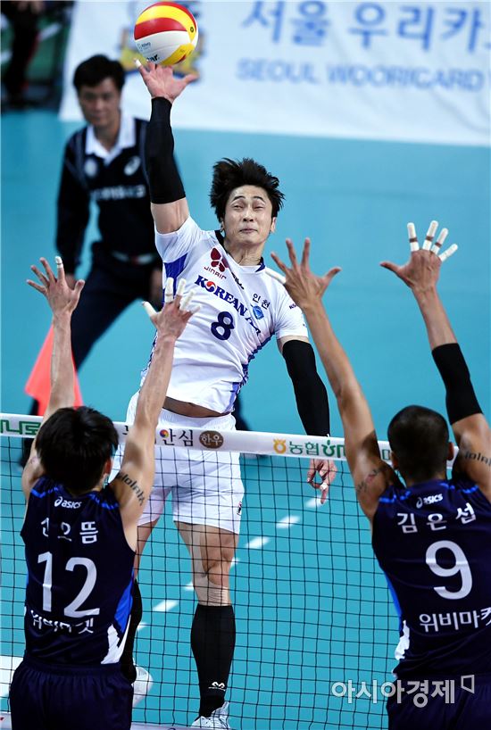 [아시아경제 김현민 기자]프로배구 우리카드와 대한항공의 2016-2017 정규리그 경기가 24일 서울 장충체육관에서 열렸다. 대한항공 김학민이 상대 블로킹을 뚫고 공격하고 있다.