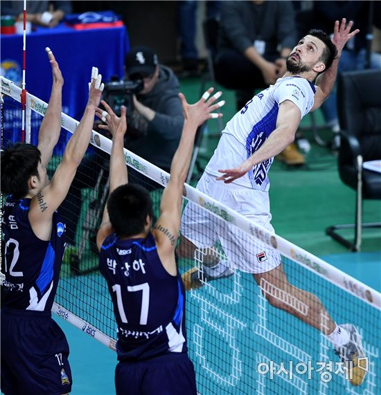 [아시아경제 김현민 기자]프로배구 우리카드와 대한항공의 2016-2017 정규리그 경기가 24일 서울 장충체육관에서 열렸다. 대한항공 가스파리니가 상대 블로킹을 뚫고 공격하고 있다.
