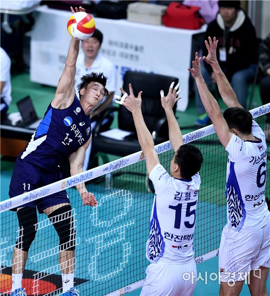 [아시아경제 김현민 기자]프로배구 우리카드와 대한항공의 2016-2017 정규리그 경기가 24일 서울 장충체육관에서 열렸다. 우리카드 최홍석이 상대 블로킹을 뚫고 공격하고 있다.