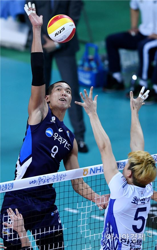 [아시아경제 김현민 기자]프로배구 우리카드와 대한항공의 2016-2017 정규리그 경기가 24일 서울 장충체육관에서 열렸다. 우리카드 김은섭이 상대 블로킹을 뚫고 공격하고 있다.