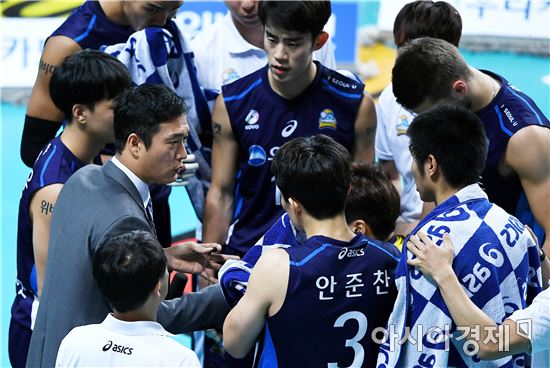[아시아경제 김현민 기자]프로배구 우리카드와 대한항공의 2016-2017 정규리그 경기가 24일 서울 장충체육관에서 열렸다. 우리카드 김상우 감독이 작전을 지시하고 있다.