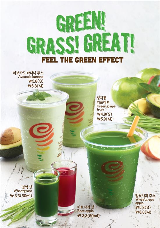 이 밖에도 ‘밀싹사과 주스’와 ‘아보카도 바나나 주스’, ‘청자몽 리프레셔’도 내놨다. 아보카도 바나나 주스는 비타민과 무기질, 식이섬유가 풍부한 아보카도와 속을 든든하게 채울 수 있는 바나나로 만들어 식사대용으로 손색없다. 밀싹사과 주스는 달콤한 사과를 더해 밀싹 주스를 보다 편안하게 즐길 수 있다. 청자몽 리프레셔는 비타민C와 미네랄이 풍부한 청자몽으로 상큼한 맛을 더한 시원한 주스 타입의 음료다.