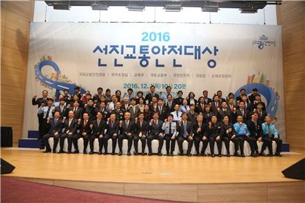 1일 국회 의원회관 대회의실에서 열린 '2016 선진교통안전대상 시상식' 후 수상자들이 기념사진을 찍고 있다. 앞줄 왼쪽부터 교통안전공단 오영태 이사장, 손해보험협회 장남식 회장, 한국도로공사 김학송 사장, 교육부 공병영 국장, 경찰청 김귀찬 차장, 국민안전처 이성호 차관, 국토교통부 김경환 차관, 국회 교통안전포럼 이춘석 대표, 새마을교통봉사대 김수연 대장, 국회 교통안전포럼 윤후덕 부대표, 시민교통안전협회 김기복 대표, 녹색어머니중앙회 강윤례 회장, 사랑실은교통봉사대 손삼호 대장,전국모범운전자연합회 윤석범 회장, 국무조정실 신강민 안전관리과장(훈장수상자), 전국모범운전자연합회 심상하 강원지부장(포장 수상자).