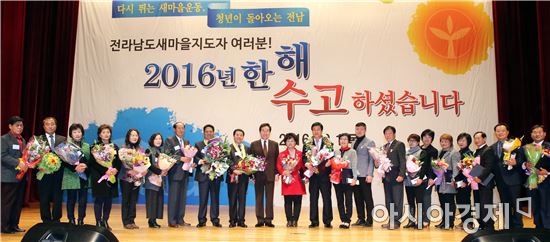 [아시아경제 노해섭 기자]이낙연 전남지사가 2016년 전라남도 새마을지도자대회에서 도정발전 기여 수상자들과 기념촬영하고 있다. 이날 행사는 임명규 도의회 의장, 권욱 도의회 부의장, 도의원, 황금영 전라남도 새마을회 회장과 회원 등 800여명이 참석해 1일 도청 김대중강당에서 열렸다.