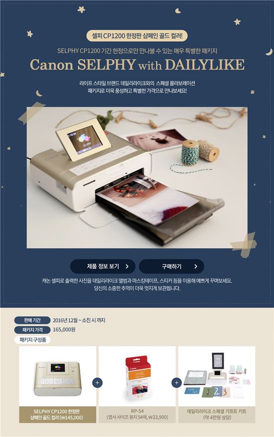 셀피 CP1200과 엽서 사이즈 용지 54매, D.I.Y. 키트로 구성된 캐논 셀피 with 데일리라이크 선물 패키지 가격은 16만5000원이다.