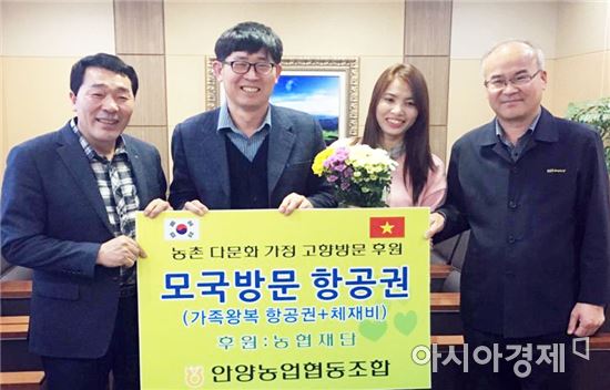 지난 1일 안양농협에서는 지역의 농촌 조합원인 결혼이민자 부부와 그 자녀가 베트남을 왕복할 수 있는 항공권과 체재비 및 여행자보험 가입비용 일체를 지원했다.