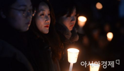 [아시아경제 문호남 인턴기자] 박근혜 정권 퇴진 비상국민행동을 비롯한 시민들이 7일 서울 여의도 새누리당사 앞에서 열린 '박근혜 즉각 퇴진! 새누리당 해체! 국정농단 공범 새누리당 해체' 촛불집회에서 촛불을 들고 있다.