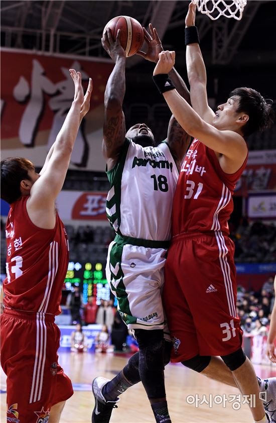 [고양=아시아경제 김현민 기자]프로농구 고양 오리온과 원주 동부의 2016-2017 정규리그 경기가 11일 고양체육관에서 열렸다. 동부 맥키네스가 상대 수비를 뚫고 공격하고 있다.