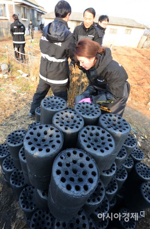 [아시아경제 백소아 기자] 13일 경기도 부천시 오정구 대장동에서 열린 대한항공 노사합동 연탄나누기 행사에서 대한항공 임직원들이 연탄을 나르고 있다.