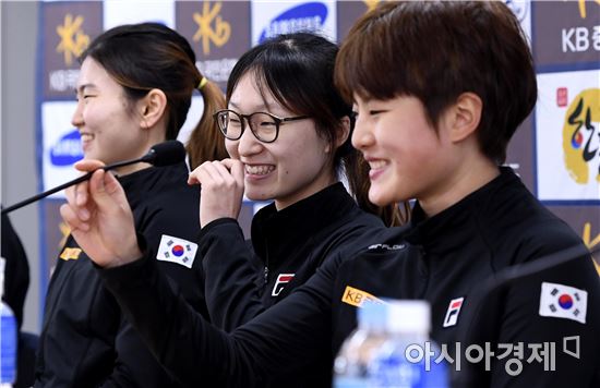 [강릉=아시아경제 김현민 기자] ISU 쇼트트랙 4차 월드컵대회 한국대표팀의 미디어데이가 14일 강원도 강릉 아이스아레나에서 열렸다. 여자대표팀 심석희(왼쪽부터), 최민정, 김혜빈이 웃음을 터뜨리고 있다.