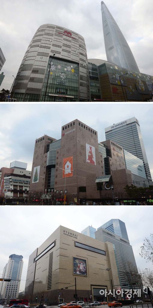 [아시아경제 백소아 기자] 정부가 서울 시내면세점을 운영할 추가 사업자로 롯데·현대백화점·신세계를 선정했다. 사진은 18일 서울 송파구 잠실 롯데월드타워 모습, 서울 서초구 신세계백화점 강남점 모습, 서울 강남구 현대백화점 무역센터점 모습(위에서부터)