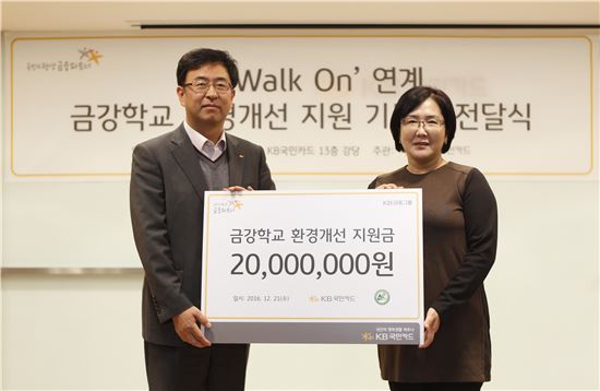 국민카드는 21일 서울 종로구 국민카드 본사에서 새터민 자녀들이 다니는 금강학교에 기숙사 환경 개선을 위한 기부금 2000만원을 전달했다고 밝혔다.