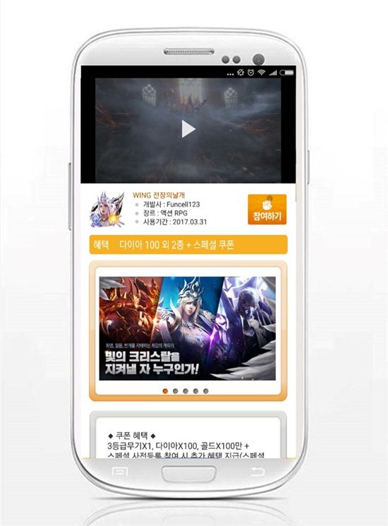 이번에 쿠폰이 추가된 게임은 ‘WING 전장의 날개’로 별다른 미션 없이 사전예약 신청만 해도 게임 론칭 후 ‘3등급 무기 1개’, ‘다이아 100개’, ‘100만 골드’를 100% 지급한다.
