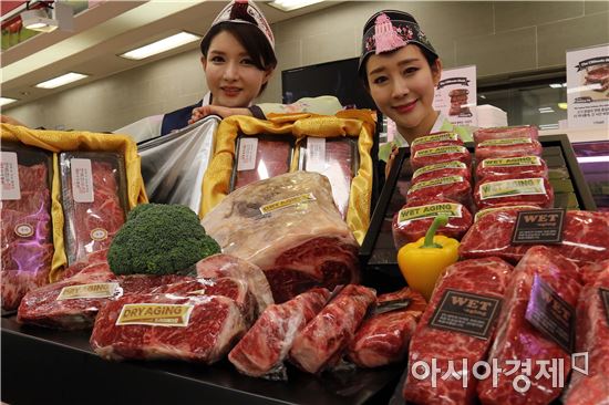 [아시아경제 김현정 기자] 이마트가 자체 축산물 가공, 저장 설비인 미트센터에서 숙성과정을 거친 숙성한우 선물세트 5종을 피코크 선물세트로 준비했다고 26일 밝혔다. 대표 상품은 '피코크 WET에이징 한우등심 세트 1++등급' 27만원, '피코크 WET에이징 스테이크 세트' 25만8000원이며, 피코크 드라이에이징 세트는 53만원에 만나볼 수 있다. 서울 한강로 이마트 용산점에서 모델들이 피코크 숙성한우 선물세트를 선보이고 있다.