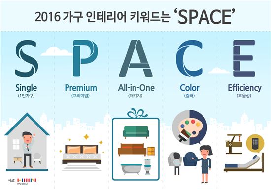 [아시아경제 임온유 기자] 2016년 가구 인테리어 키워드는 ‘S.P.A.C.E’다. 바로 ‘Single(1인가구)’, ‘Premium(프리미엄)’, ‘All-in-One(패키지)’, ‘Color(컬러)’, ‘Efficiency(효율성)’.