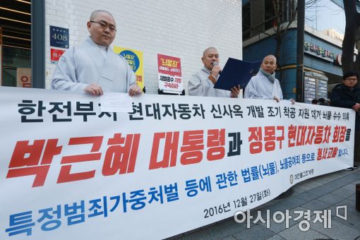 [아시아경제 문호남 인턴기자] 대한불교조계종이 27일 오전 서울 강남구 특별검사 사무실 앞에서 박 대통령과 정몽구 현대차 회장의 '한전부지 현대자동차 신사옥 개발 조기 착공 지원 대가 뇌물 수수 의혹'을 주장하며 형사고발 기자회견을 갖고 있다.