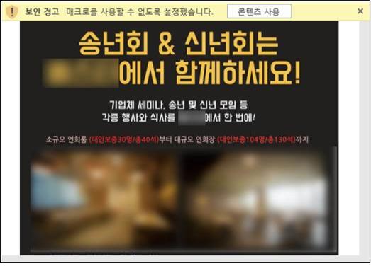 이번에 발견된 악성 파일은 송년회 및 신년회 행사 장소를 안내하는 내용처럼 위장한 마이크로소프트(MS) 오피스의 워드(*.doc) 문서 파일로 위장한 것으로 나타났다. 문서 파일을 실행하면 워드 문서에 저장된 매크로가 실행되는 형태다.