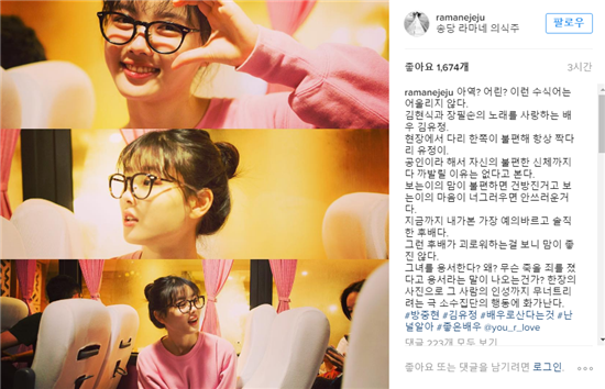 그가 올린 글은 "아역? 어린? 이런 수식어는 어울리지 않다. 김현식과 장필순의 노래를 사랑하는 배우 김유정. 현장에서 다리 한쪽이 불편해 항상 짝다리 유정이. 공인이라 해서 자신의 불편한 신체까지 다 까발릴 이유는 없다고 본다"라는 글로 시작했다.