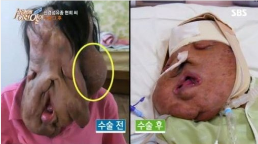 지난 10월 가을 신경섬유종을 앓고 있는 현희씨의 얼굴은 커다랗게 자라난 혹으로 뒤덮여 있었다.