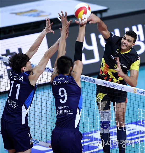 [아시아경제 김현민 기자]프로배구 우리카드와 OK저축은행의 2016-2017 정규리그 경기가 3일 서울 장충체육관에서 열렸다. OK저축은행 모하메드가 상대 블로킹을 뚫고 공격하고 있다.