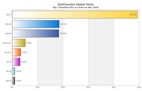 보고서에 따르면 중국에서 가장 많이 사용하는 PC OS는 윈도우7이다. 49.36%의 사용률로 두대 중 한대 꼴로 윈도우7을 쓰고 있다.