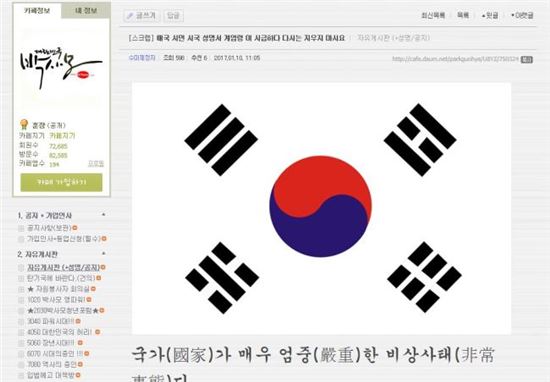 박사모 한 회원은 10일 박사모 커뮤니티 자유게시판에 "애국시민 시국성명서 '계엄령이 시급하다'글을 지우지 마세요"라는 제목의 글과 함께 태극기 사진을 첨부했다.