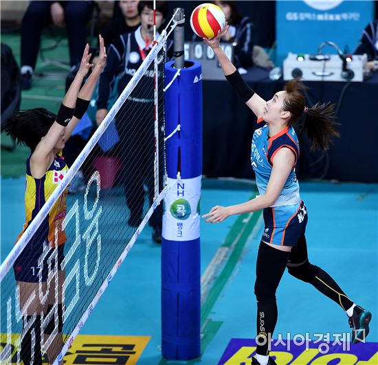 [아시아경제 김현민 기자]여자프로배구 GS칼텍스와 KGC인삼공사의 2016-2017 정규리그 경기가 6일 서울 장충체육관에서 열렸다. GS칼텍스 황민경이 상대 블로킹을 뚫고 공격하고 있다.