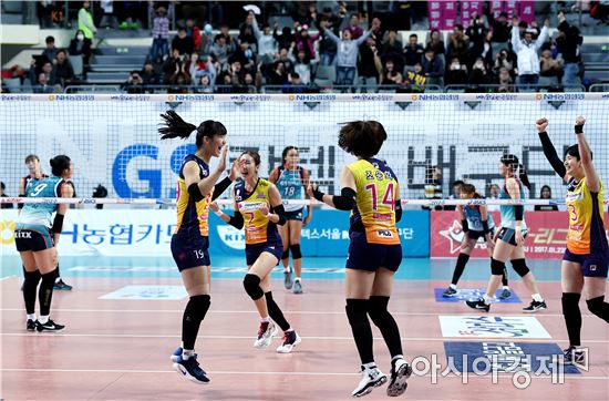 [아시아경제 김현민 기자]여자프로배구 GS칼텍스와 KGC인삼공사의 2016-2017 정규리그 경기가 6일 서울 장충체육관에서 열렸다. 흥국생명 선수들이 세트스코어 3-1 승리를 확정한 뒤 기뻐하고 있다.