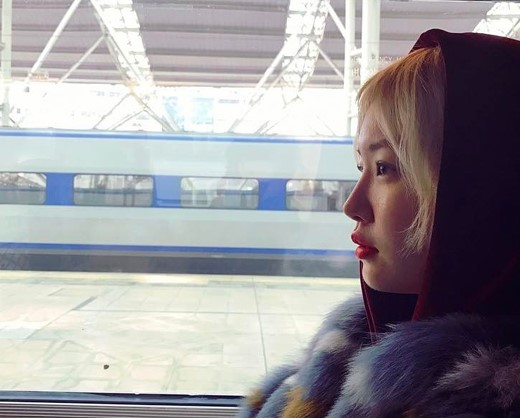 공개된 사진 속에서 김새롬은 기차 안에서 후드를 쓰고 있다.