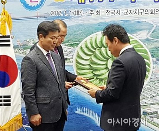 [아시아경제 노해섭 기자]장흥군의회 유상호의원(왼쪽)이 지난 17일 개최된 제199차 전국 시·군·자치구의회의장협의회(회장 황영호)에서 수여하는 지방의정 봉사상을 수상하는 영예를 안았다.