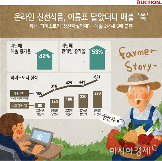 20일 옥션에 따르면 2014년 하반기 출시된 파머스토리의 매출이 작년 하반기를 기준으로 2년만에 6배(521%) 뛰었다. 지난 한 해 실적만 보면 판매량이 전년 대비 53% 늘었고, 매출은 1년만에 42% 증가했다.