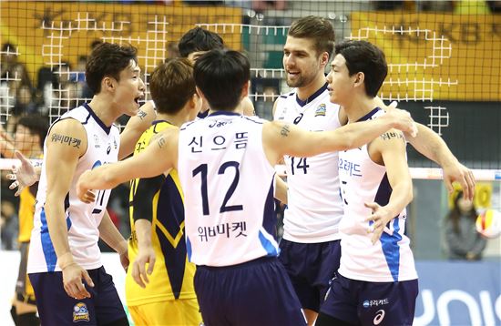 우리카드는 29일 구미 박정희체육관에서 열린 NH농협 2016~2017 V리그 남자부 5라운드 원정경기에서 KB손해보험에 세트스코어 3-0(25-18 25-23 25-23)으로 이겼다. 최근 2연승하며 15승 11패(승점 47)로 현대캐피탈(15승 10패·승점 44)을 밀어내고 2위로 도약했다. 선두 대한항공(승점 50)과 격차는 3점으로 좁혔다.