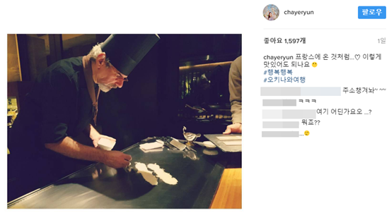 두 사람이 여행 중이던 7일 차예련은 자신의 SNS에 요리사 사진과 함께 "프랑스에 온 것처럼...♡ 이렇게 맛있어도 되나요"라는 글을 게재했다. 이어 '#행복행복 #오키나와여행'을 해시태그로 설정했다.