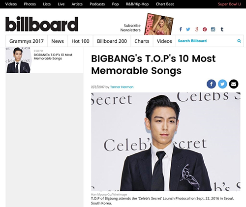 빌보드는 9일(한국시간) 탑의 군입대 소식을 전하면서 ‘탑의 가장 잊지 못할 노래 10곡(BIGBANG’s T.O.P’s 10 Most Memorable Songs)’을 선정해 발표했다.