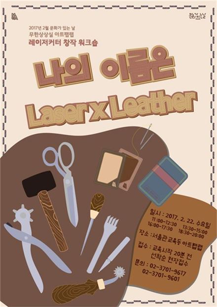 이번 행사는 ‘무한상상실 아트팹랩’ 레이저 커터 창작워크숍으로 신매체 기기인 레이저 커터와 가죽공예 기법을 활용한 디지털 패브리케이션(Digital Fabrication) 워크숍이다. 참여자들은 레이저 커터를 활용해 제작된 가죽과 가죽공예 도구를 활용해 직접 이름표를 제작할 수 있다.