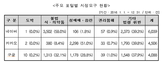 포털 사업자 별로는 네이버 6039건, 카카오 4506건, 구글 4088건 순이었다.