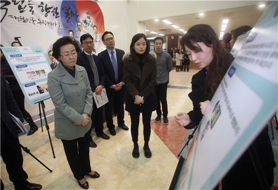 [아시아경제 박종일 기자] 신연희 강남구청장이 22일 오전 서울 강남구청에서 열린 청년창업지원센터 제6기 졸업전시회에 참석해 졸업기업 홍보에 대한 설명을 들었다.
