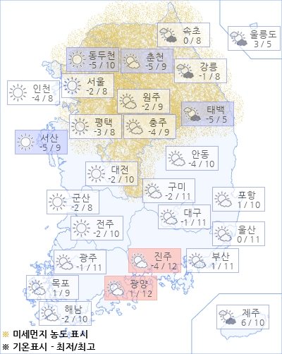 미세먼지 농도: 오전 강원·충북·수도권 지방은 ‘나쁨’ 입니다.