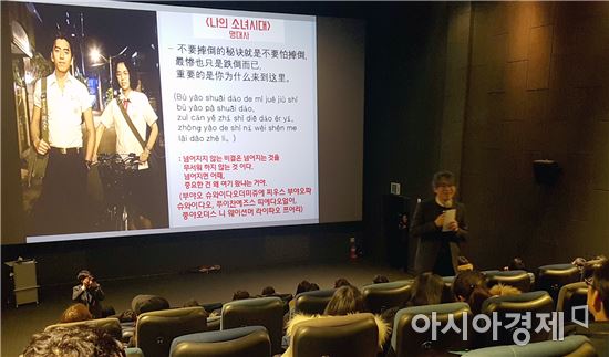 영화관람 프로그램의 하이라이트는 영화 관람 후 호남대 미디어영상공연학과 최영화 교수와 공자아카데미 쉬찬찬 강사가 진행한 ‘스크린 중국어 강의’로 영화 속 명대사를 통해 중국어를 배우고 푸짐한 선물도 주는 등 관람객들과 소통하는 시간을 가졌다.