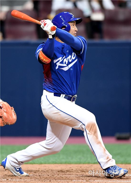 [아시아경제 김현민 기자]26일 서울 고척돔에서 열린 2017 월드베이스볼클래식(WBC) 대표팀과 쿠바와의 평가전, 7회초 2사 만루에서 대표팀 손아섭이 추가 2타점 적시타를 치고 있다.