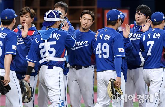 [아시아경제 김현민 기자]26일 서울 고척돔에서 열린 2017 월드베이스볼클래식(WBC) 대표팀과 쿠바와의 평가전, 7-6 역전승을 거둔 대표팀 손아섭이 동료들과 하이파이브하고 있다.