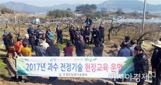 [보성=아시아경제 노해섭 기자]보성군(군수 이용부)은 지난달 28일 조성면 우천리 단감 재배 농가에서 거점농가 등 60여명이 참여한 가운데 고품질 과실 생산을 위한 단감 전정교육 및 현장실습을 실시했다.