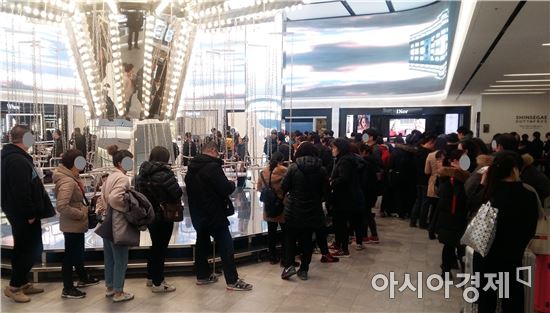 토요일인 지난 4일 서울 중구 신세계면세점 명동점은 평소와 다름없이 중국인 관광객들로 붐볐다. 화장품 매장으로 들어서자 여기저기 장사진이 눈에 띄었다. 대부분 중국인이다. 특히 LG생활건강의 고급 화장품 브랜드 '후' 매장 앞에는 200명가량이 늘어서 다른 쇼핑객들의 통행을 방해할 정도였다. 점원들에게 사드 여파가 느껴지느냐고 묻자 모두 "아직은 잘 모르겠다"고 답했다. 기다리는 중국인들도 웃으며 대화를 나누고 휴대전화로 상품을 검색하는 등 평범한 모습이었다. 상하이(上海)에서 온 30대 남녀는 "솔직히 (사드 이슈에 대해) 별 생각이 없다"며 "그저 여행을 즐기고 있을 뿐"이라고 말했다.