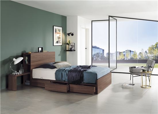 전체적으로 고급 월넛 무늬목을 사용해 고급스러움을 높였고, 헤드보드 형태 역시 편안하게 기대 사용할 수 있도록 자연스러운 곡선 형태로 디자인 됐다.