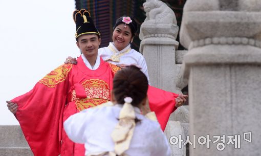 [아시아경제 문호남 수습기자] 낮과 밤의 길이가 같아지는 봄의 네 번째 절기, 춘분인 20일 서울 종로구 경복궁을 찾은 동남아 관광객들이 기념촬영을 하고 있다.