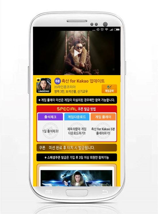 이번에 쿠폰이 추가된 모바일게임은 최근 대규모 업데이트를 실시한 ‘촉산 for Kakao’로 ‘1일 출석체크’, ‘제독의함대 게임 다운로드’, ‘5분 플레이’ 세 가지 미션을 완료하면 ‘3만 영력’, ‘신기교우’, ‘보석선물’을 지급한다.