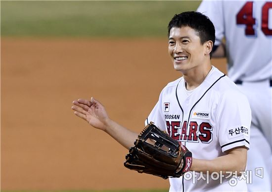[아시아경제 김현민 기자]프로야구 한화 이글스와 두산 베어스의 2017 KBO리그 개막경기가 31일 잠실구장에서 열렸다. 배우 지성이 시구한 뒤 미소 짓고 있다.