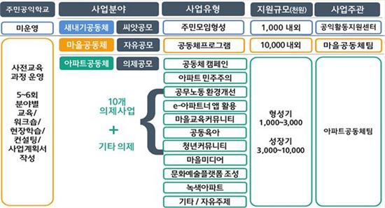 ‘마을미디어’, ‘공동육아’, ‘녹색아파트’, ‘마을교육커뮤니티’, ‘아파트공동체 캠페인’, ‘청년커뮤니티 사업’공모는 예년과 같이 진행한다.