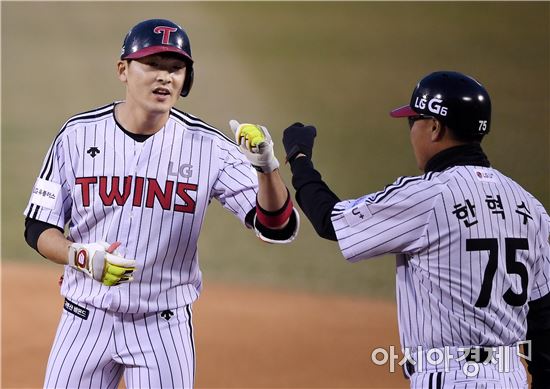[아시아경제 김현민 기자]프로야구 삼성 라이온즈와 LG 트윈스의 2017 KBO리그 경기가 4일 잠실구장에서 열렸다. 1회 말 1사 만루에서 LG 이형종이 추가 2타점 적시타를 치고 한혁수 코치와 하이파이브하고 있다.